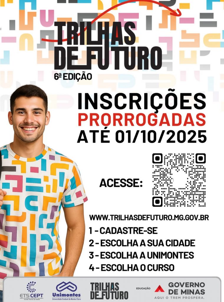 O Centro de Educação Profissional e Tecnológica (CEPT), por meio da Escola Técnica de Saúde, ambos vinculados à Universidade Estadual de Montes Claros (Unimontes), segue com oferta de cursos técnicos da 6ª edição do programa Trilhas de Futuro em Montes Claros, Bocaiuva, Brasília de Minas, Espinosa, Manga Unaí, Janaúba, Joaíma e Taiobeiras. Trata-se de iniciativa do Governo de Minas que possibilita acesso gratuito à formação técnica de qualidade, com direito a auxílio, para estudantes e egressos do ensino médio.