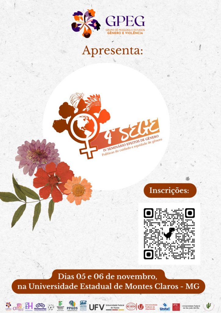 Estão abertas as inscrições para participação e submissão de trabalhos no 4º Seminário Efeitos de Gênero (SeGe), que tem como tema “Políticas do Cuidado e a Equidade de Gênero”. O evento, em formato híbrido, será realizado nos dias 5 e 6 de novembro, sob organização do Grupo de Pesquisa e Estudos Gênero e Violência (GPeg) da Universidade Estadual de Montes Claros (Unimontes), em parceria com o Grupo de Trabalho Estudos de Gênero e Feminismos da Associação Nacional de História – Seção Minas Gerais (ANPUH-MG). Haverá atividades presenciais no Centro de Ciências Humanas (CCH), localizado no Prédio 2 do campus-sede da Unimontes, além de transmissões de conferências e mesas-redondas pelo canal no YouTube (@gpeg-unimontes5843).