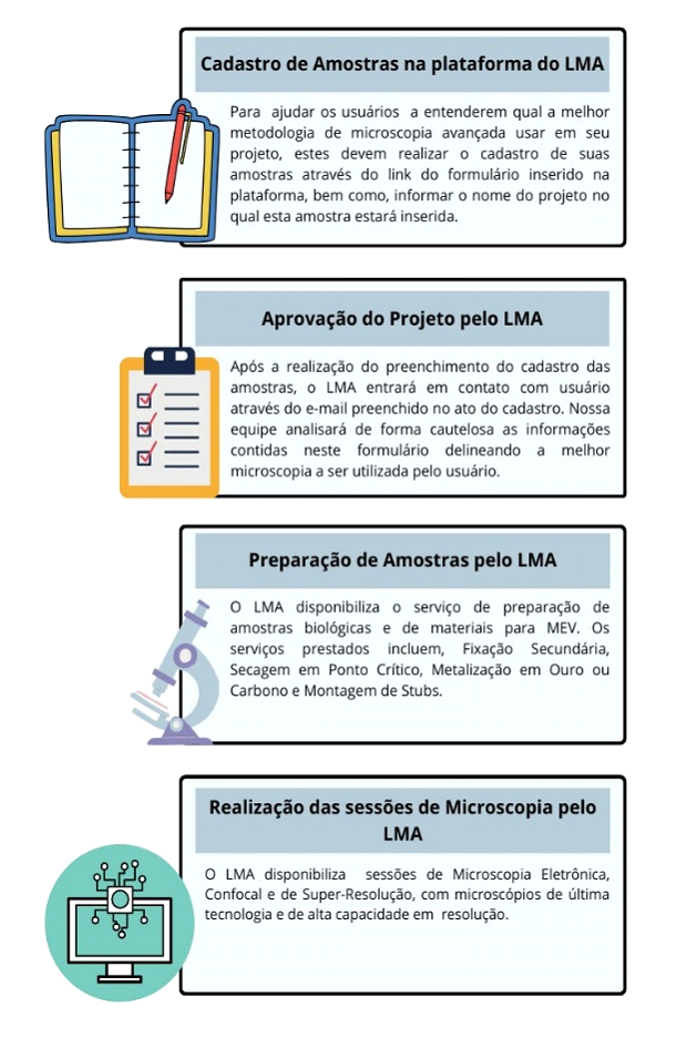 Os usuários deveram primeiramente realizar o cadastro de usuário através do formulário (Formulário para cadastro de usuários do LMA) disponível em nossa plataforma, disponibilizando as informações necessárias e pertinentes sobre seu projeto, suas amostras e o serviço no qual deveremos realizar.