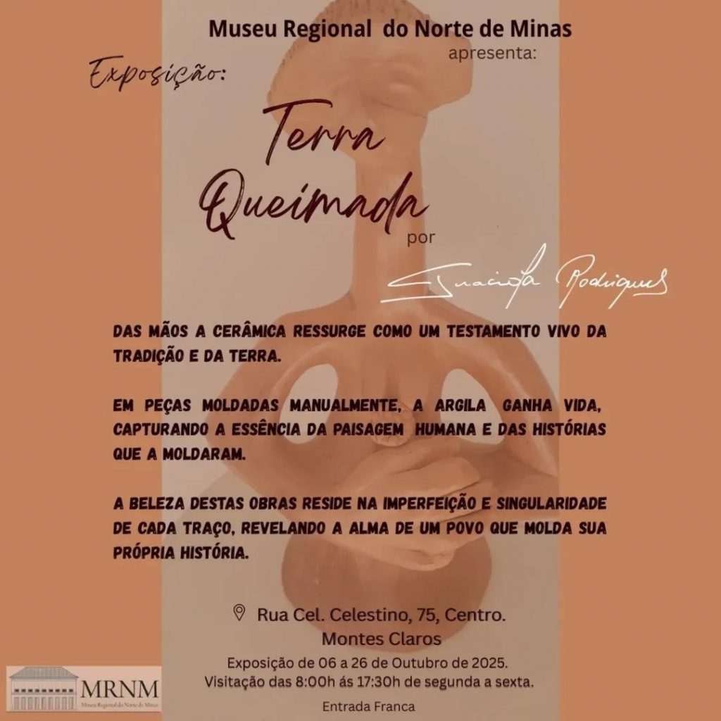 O Museu Regional do Norte de Minas (MRNM), vinculado à Universidade Estadual de Montes Claros (Unimontes), abre logo mais, às 13h30min desta segunda-feira (06/10), a exposição “Terra Queimada”, da artista Graciola Rodrigues. A mostra pode ser visitada até o dia 26 de outubro na sede do MRNM, situado na rua Coronel Celestino, 75, centro histórico da cidade. O acesso é gratuito.