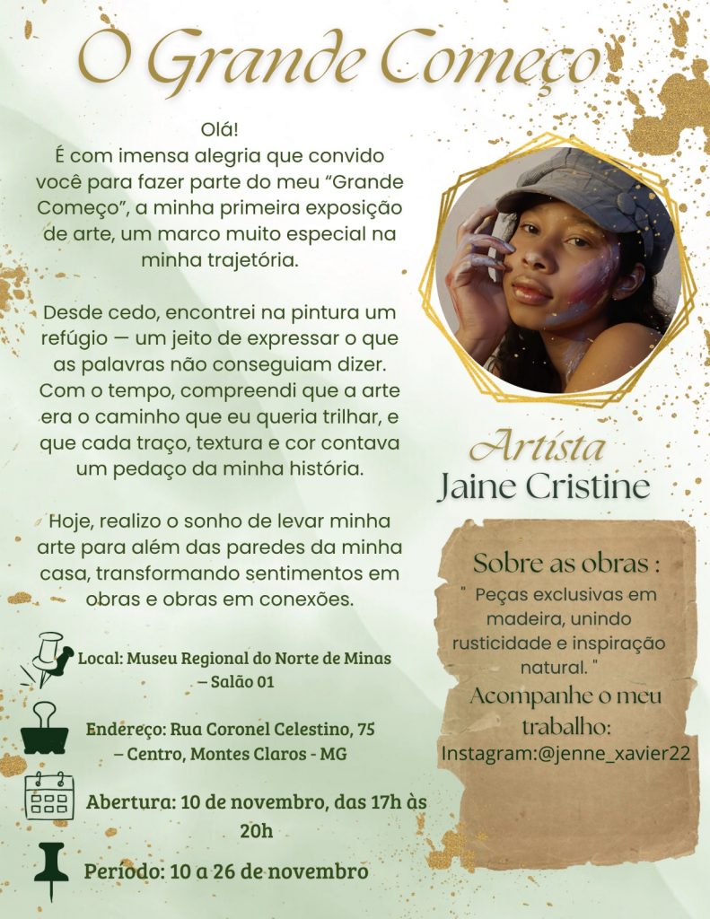 A abertura está prevista para o dia 10 de novembro, das 17 às 20 horas, com visitação até o dia 26 de novembro. Contato pelo Instagram: @jenne_xavier22.