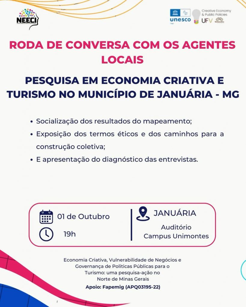 Nesta quarta-feira (01/10), o Núcleo de Estudos em Economia Criativa e Inovação (NEECi) da Universidade Estadual de Montes Claros (Unimontes) promoverá em Januária, um encontro com a comunidade local para detalhamento de projeto de pesquisa em economia criativa e turismo desenvolvido na região. A roda de conversa com os agentes locais está marcada para as 19 horas, no auditório do campus da Unimontes no município.