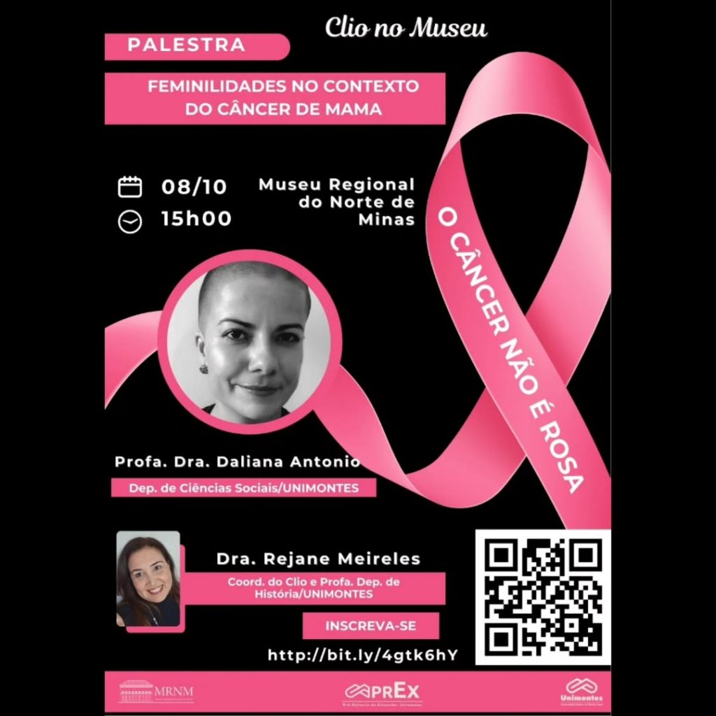 O Museu Regional do Norte de Minas (MRNM), vinculado à Universidade Estadual de Montes Claros (Unimontes), vai oferecer, na próxima quarta-feira (08/10), palestra sobre “O câncer não é rosa: Feminilidades no contexto do Câncer de Mama”. O tema será abordado pela médica Daliana Antônio, que atua no Departamento de Política e Ciências Sociais da Unimontes, com mediação da professora Rejane Meireles, vinculada ao Departamento de História da instituição de ensino superior. As inscrições seguem abertas pelo link http://bit.ly/4gtk6hY. Haverá entrega de certificado.