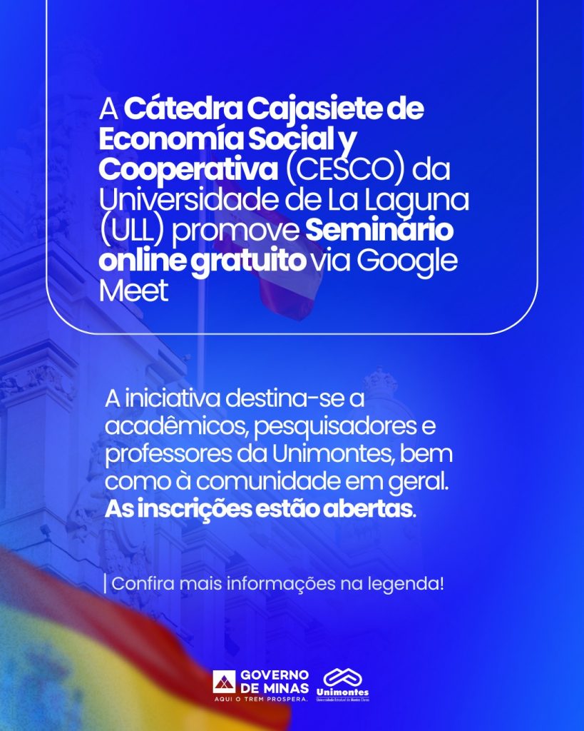O evento online é promovido pela Cátedra Cajasiete de Economía Social y Cooperativa (CESCO) da Universidade de La Laguna (ULL), nas Ilhas Canárias, Espanha, com o tema “Bancos de Desenvolvimento e Inclusão Financeira: Análise do Crédito Solidário do Banco do Nordeste do Brasil e seus Impactos Sociais e Territoriais”, artigo de autoria da docente da Unimontes. Ela vai abordar o assunto às 16h (horário da Espanha), 13h (horário de Brasília), pelo Google Meet. O objetivo é fomentar a internacionalização no âmbito da Unimontes e fortalecer as ações de cooperação acadêmica com instituições internacionais.